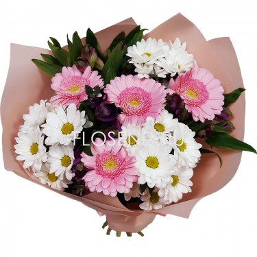 Авторский букет с бигуди-хризантемой, французскими розовыми розами, кустовыми розами и диантусами