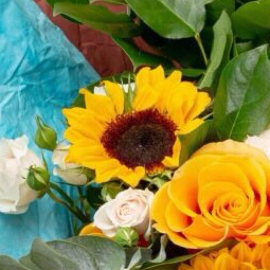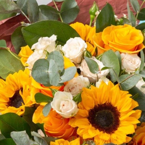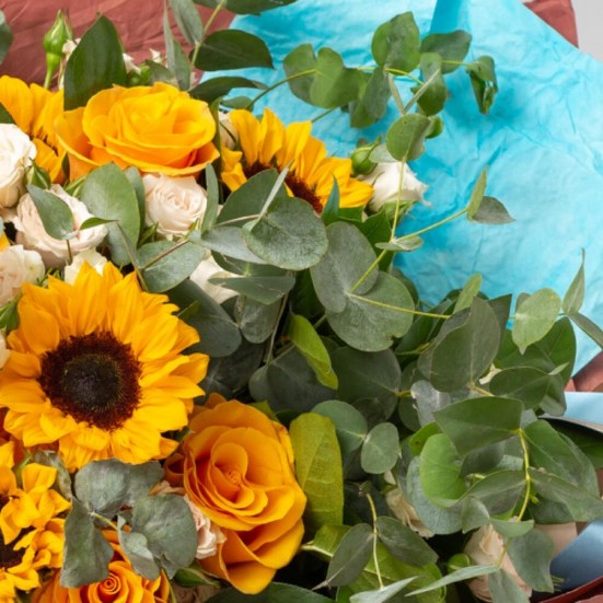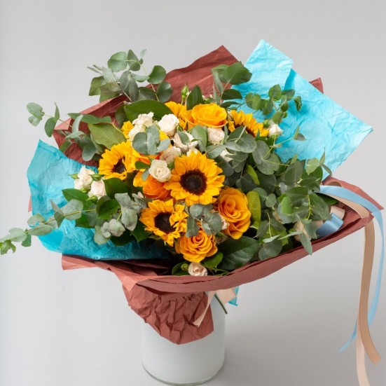 Букет с подсолнухами и розами