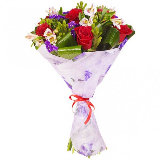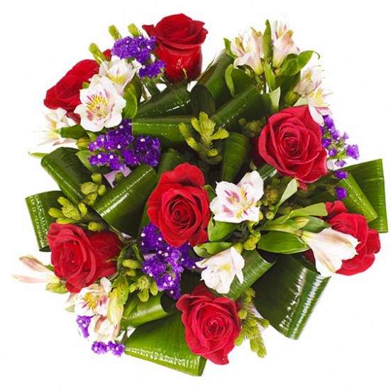 Букет из красных роз и белой альстромерии